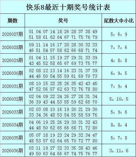 福彩快乐8第2026036期开奖回顾:03 11 19 27 32 33 35 38 43 46 49 50 63 64 66 67 74 75 76 77,其中包含3个小尾奖号:11、32、50;包含11个中尾奖号:03、33、35、43、46、63、64、66、74、75、76;包含6个大尾奖号:19、27、38、49、67、77。